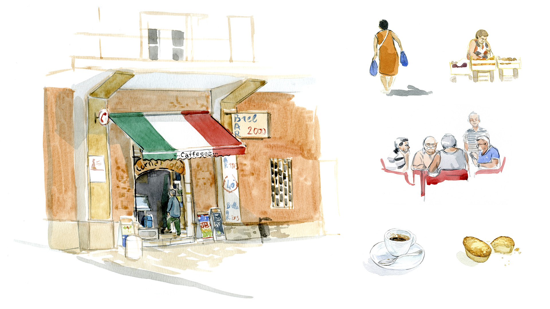 Une place de village… Quelques palmiers, des façades colorées, 2 ou 3 bancs…le décor est planté. Des enfants jouent au ballon, quelques hommes aux cartes à la terrasse d'un café. Sur les étals du marché les tomates et les figues sont gorgées de soleil, les cabas se remplissent au son des rires, des cris, des chants… Les cloches de l'église sonnent l'heure.
